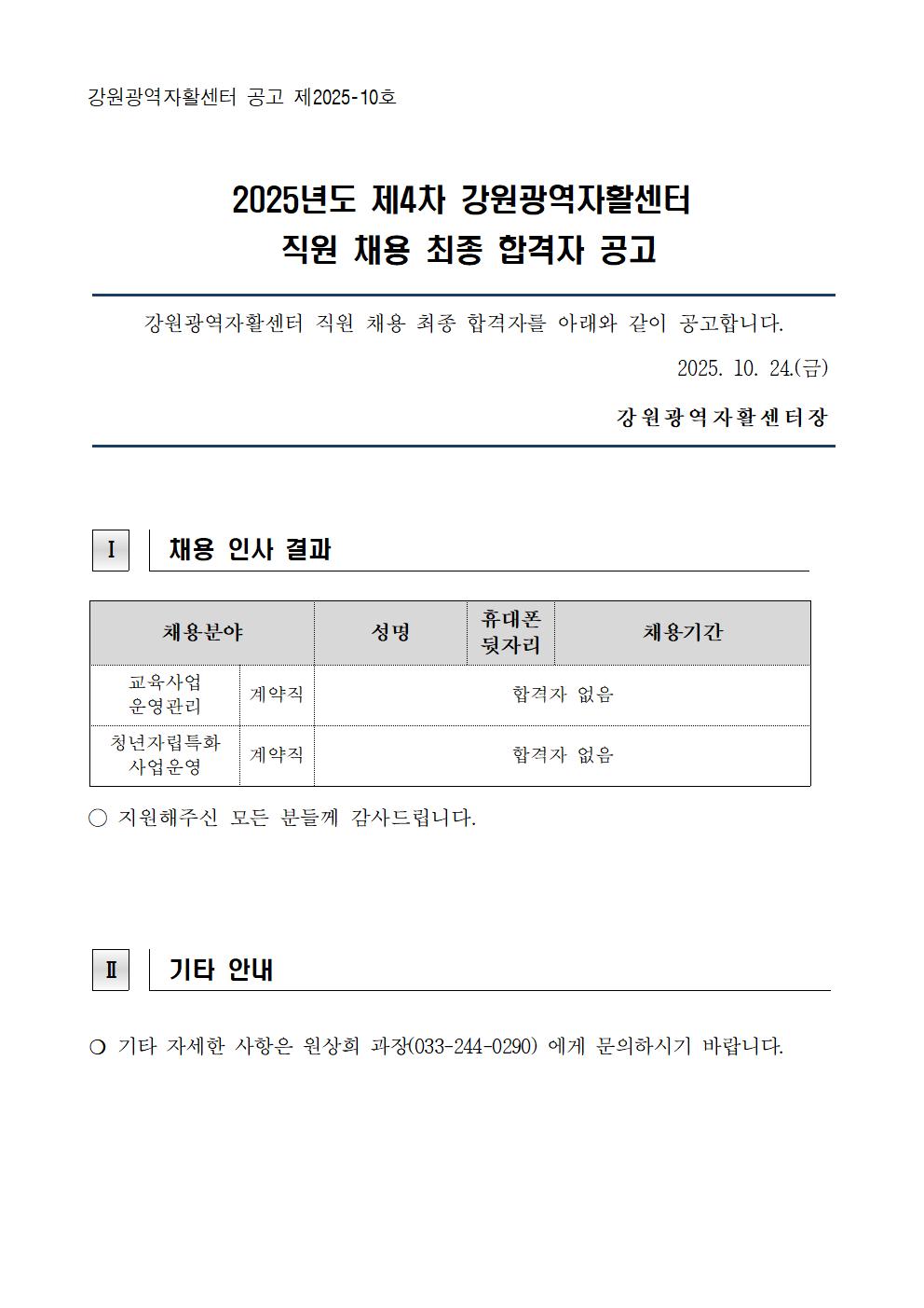2025년 강원광역자활센터 2차 추가경정 세입,세출 예산 공고